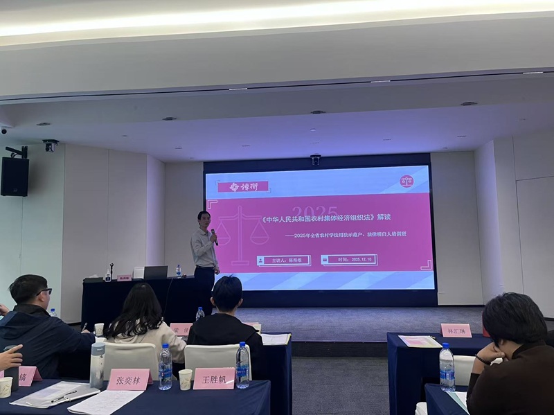 在此之前的12月10日,陈得雄律师还应广东省农业农村厅邀请,在全省农村学法用法示范户、法律明白人培训班上,围绕《农村集体经济组织法》解读主题进行授课。他结合五十余场法治宣讲的丰富经验,聚焦集体资产交易、成员身份认定、民主管理程序与争议解决路径等核心实务问题,通过案例化、通俗化的讲解,为基层法治人才提供了扎实的法律操作指引,提升了基层普法与依法治理能力。