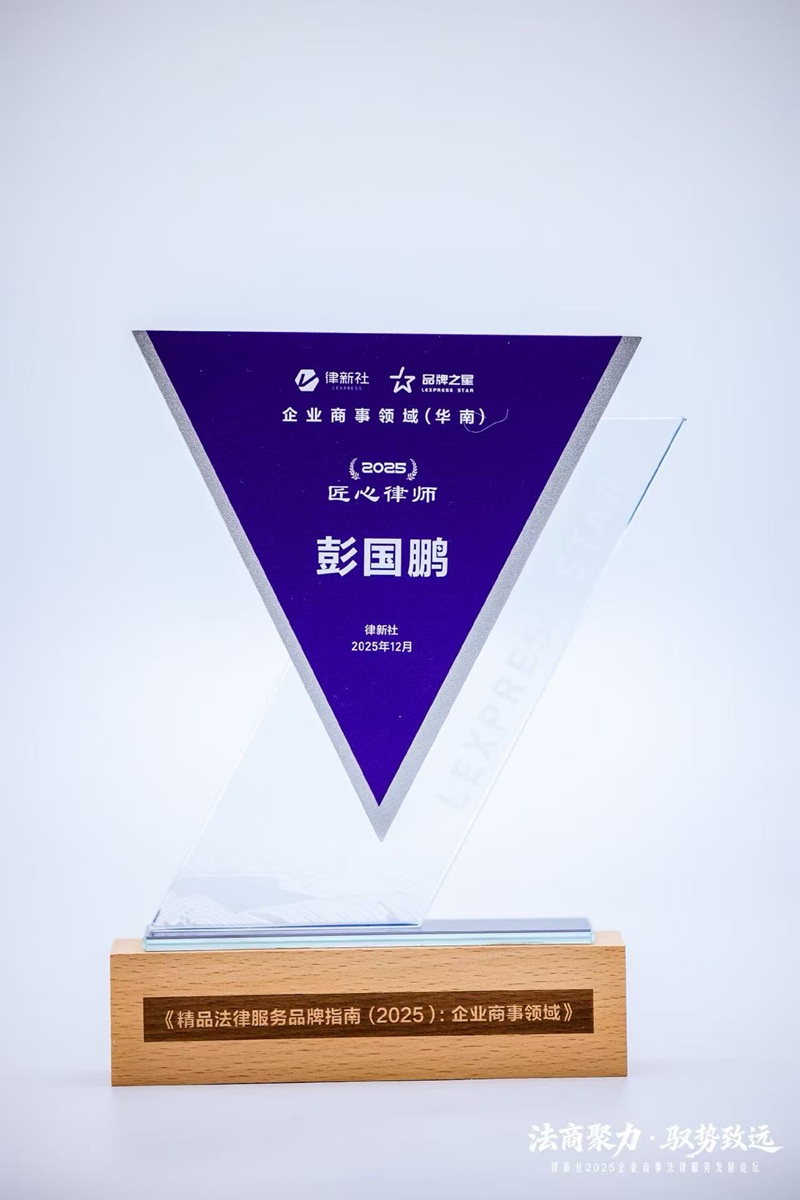 再次恭喜彭国鹏律师获此殊荣,这份荣誉既是认可,也是鞭策。未来,彭律师将继续带领团队,秉承专业、严谨的执业精神,不断精进,为客户创造更大价值,为法治化营商环境建设贡献力量。