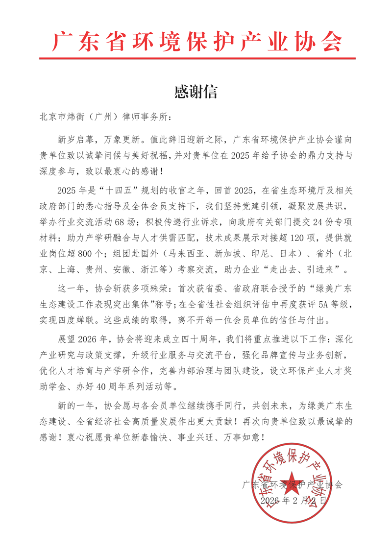 近日,北京市炜衡(广州)律师事务所接连收到两封来自重要客户的感谢信,信中对炜衡广州郑宇律师团队在2025年度的专业表现给予充分肯定,特别赞扬律师团队以高度责任感与专业精神,护航客户稳健发展。