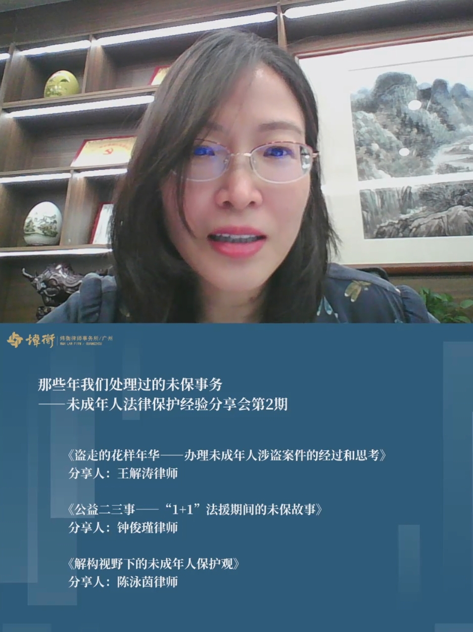 此次分享会由炜衡广州高级合伙人陈刚文律师担任主持人,并邀请广东百勤律师事务所王解涛律师、北京市盈科(深圳)律师事务所钟俊瑾律师、广东侨都律师事务所陈泳茵律师三位嘉宾共同就未成年人保护这一重要议题展开深入交流。