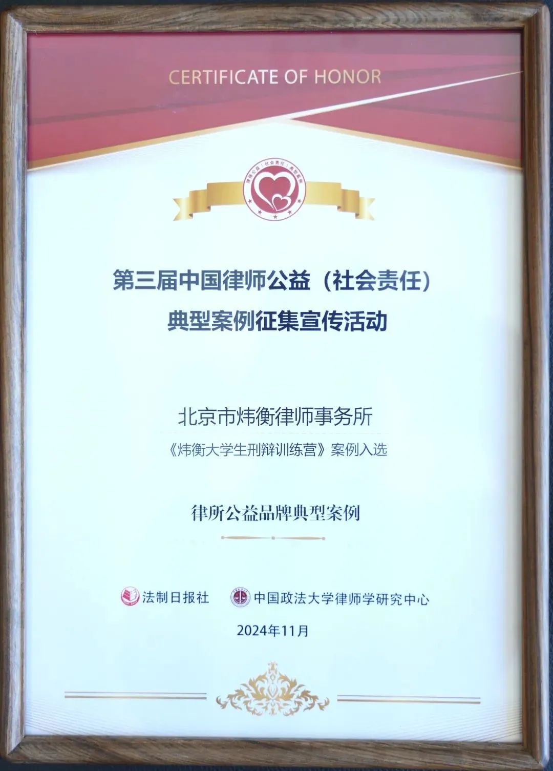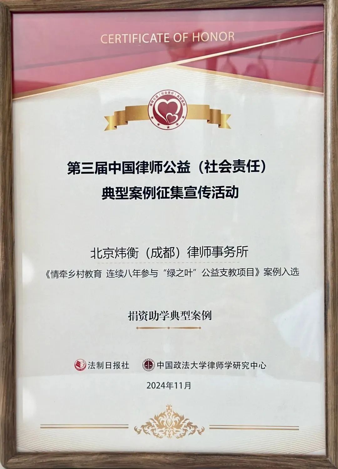 炜衡北京总所《炜衡大学生刑辩训练营》入选“律所公益品牌典型案例”,炜衡深圳所余文景律师《深圳151名员工逾四百万工资遭拖欠,法援律师多方协商解薪愁》入选“法律援助典型案例”,炜衡成都所《情牵乡村教育,连续八年参与“绿之叶”公益支教项目》入选“捐资助学典型案例”。